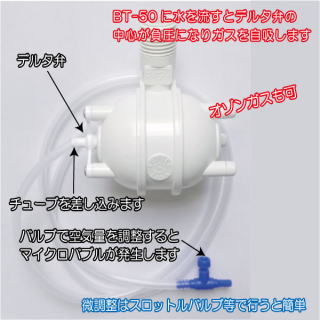 BT-50は、カスケードポンプ等を利用し、気液混合水をBT-50内へ送り込む以外に、デルタ弁にチューブを接続することにより気体を自吸させることが可能です。特にオゾンマイクロバブルの場合は、他のマイクロバブル発生器と比べ簡単です。