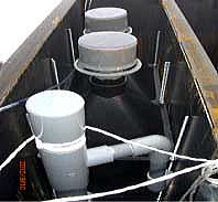 エアーポンプで120L/min の空気を下部散気筒より散気。水中ポンプで水流を作り、槽内を時計回りに循環させる