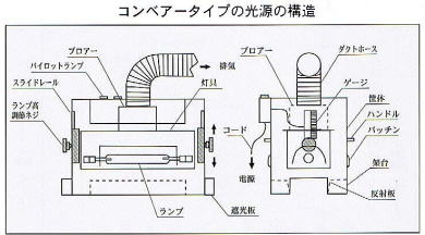 既存のコンベアーに搭載して、お手持ちのマーキング装置の後に設置すれば、簡単に自動マーキング乾燥装置になります。光源には標準的な1kW(800W/㎝)の高圧水銀ランプを使用しています。ランプ位置は上下に調節出来る構造になっていますので、光の強さと温度上昇を適当に調節出来ます。