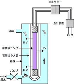 UV単独流水殺菌装置低圧水銀ランプを使った装置では、ポピュラーな流水殺菌装置です。水中に浮遊している 細菌やウィルスを253.7nmの紫外線照射により、死滅させる装置です。